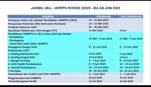 - Pendaftaran Uji Kinerja (UKIN)-UKMPPG bagi peserta Retaker melalui perguruan tinggi penyelenggara PPG dapat dilakukan pada tanggal 26 Mei s.d. 03 Juni 2023.